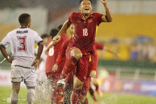 | 越南球员(红衣)与东帝汶球员激烈角逐。(图片来源:vnexpress.net) |