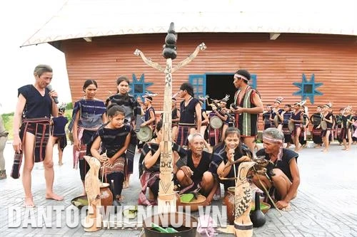 祭祀仪式结束后,村民打起鼓来,男的敲锣钲,女的在竹竿周边跳舞,村长老们边吃新米饭边喝酒。他们同时抓一把把新米,请村民和嘉宾一起吃,让其尝尝新米好不好吃,稻种好不好,进而为下个农时吸取经验。(越通社/民族与山区画报)