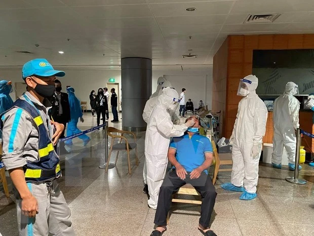 胡志明市医务人员对在新山一机场工作的所有人员进行采样检测。图自越通社