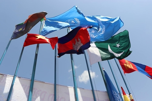 越南国旗与联合国旗帜和各国国旗在南苏丹本提乌迎风飘扬(图片来源:人民军队报)