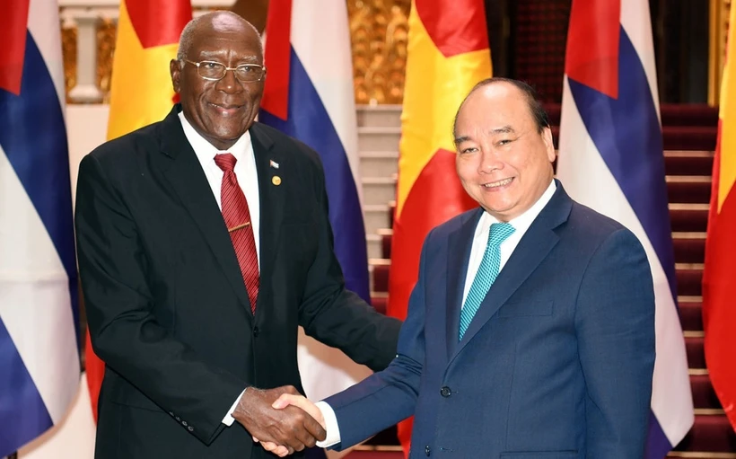 2018年9月13日,时任越南政府总理的阮春福会见古巴国务委员会兼部长会议第一副主席萨尔瓦多·巴尔德斯·梅萨。图自越通社