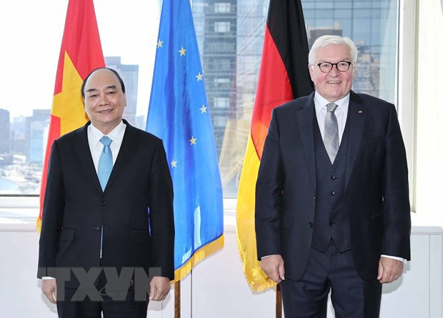 越通社特派记者报道,纽约时间9月24日,越南国家主席阮春福会见了德国总统弗兰克-瓦尔特·施泰因迈尔。会见时,两位领导人对在纪念越南与德国战略伙伴关系建立10周年(2011.10.11-2021.10.11)前夕有机会会面表示高兴,并认为,45年来,越南与德国的亲密和信任关系向来蓬勃发展,并在各领域日益向纵深发展。