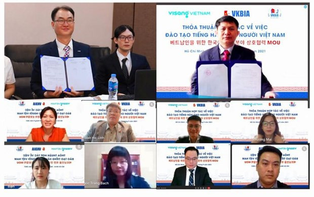 签署仪式以视频方式举行。越南祖国阵线中央委员会委员、越南与韩国企业家与投资者协会主席陈海玲博士,VKBIA协会股份公司总经理范海定和越南VISANG教育集团总经理李英根(Lee Young Geun)等出席签署仪式。