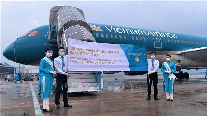 越南航空从美国飞往越南定期航班首飞。图自越通社