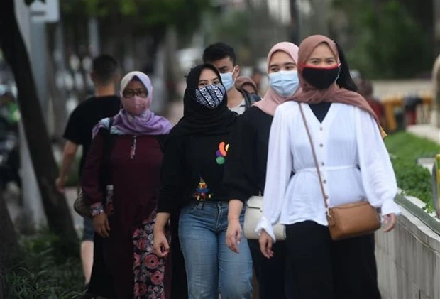 印尼首都雅加达市民佩戴口罩预防感染新冠病毒。图自越通社