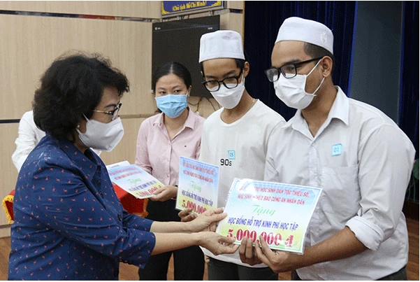 1月17日下午,胡志明市越南祖国阵线委员会同胡志明市民族委员会和人民公安报联合举行仪式,接收捐助资金并向该市少数民族大学生和贫困学生发放助学金。
