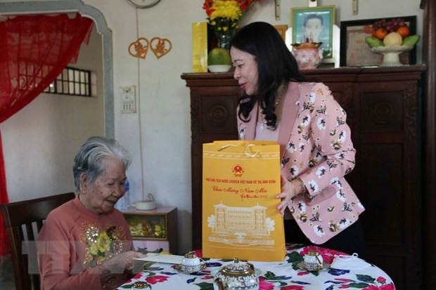 值此2022年春节即将来临之际,1月19日在茶荣省,越南国家副主席武氏映春走访慰问茶荣省佛教协会治事委员会、优抚家庭和龙德工业园区工人,并向其赠送慰问品。