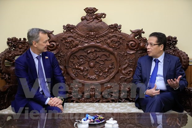 越南驻俄罗斯大使邓明魁会见了俄罗斯联邦委员会第一副议长安德烈·亚茨金。图自越通社