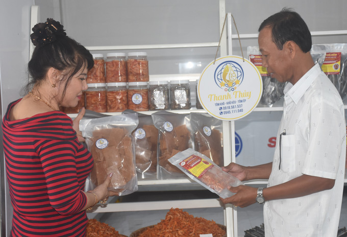 阮清水利用地方现有的原料,投资并加工了许多符合“一乡一品”(OCOP)标准的产品,例如沙虾干、长身拟平牙虾虎鱼干和白虾干等